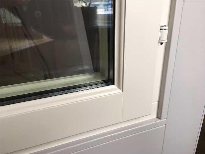 Här ser du hur våra inåtgående fönster ser ut inifrån, allmogeprofil mot glaset och en liten hålkäl runt om ytterkant. Du ser här även bultgångjärnet som vi har som standard, vid vita fönster är gångjärnet vitt.