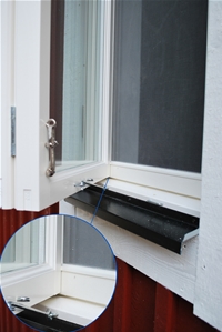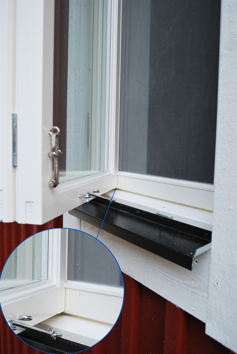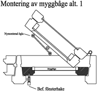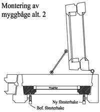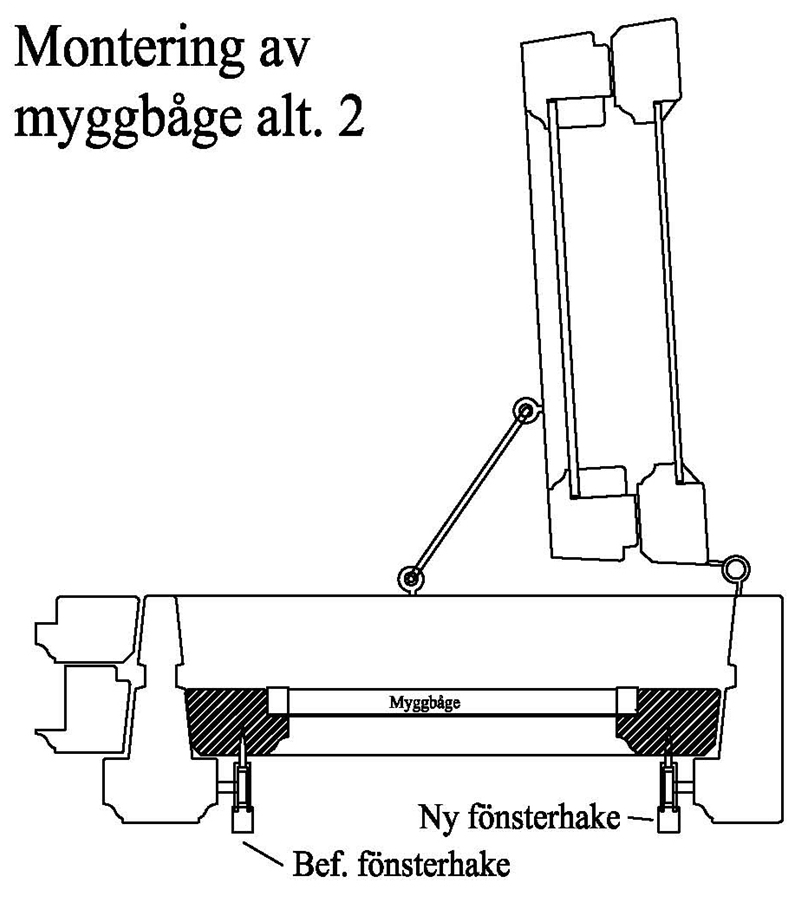 Myggbåge kläms med fönsterbåge och spänns med utvändig hasp och nymonterad ögla. Hålen för hakarna borras lika på myggbåge som på befintlig båge.