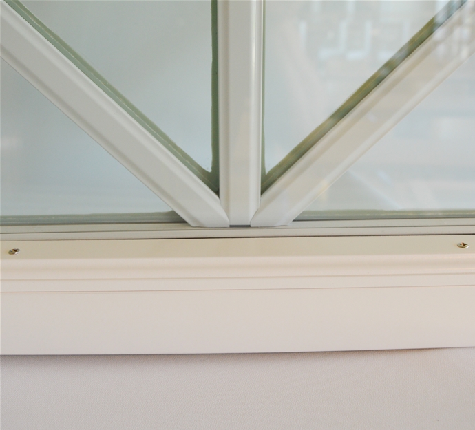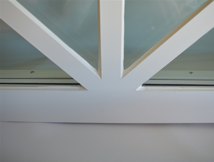 Detaljbild utifrån spröjs på halvrunt fönster, spröjstyp alt nr: 2, mellanglas spröjs i isolerglaset samt limmad spröjs på utsidan fogad med vit fogmassa