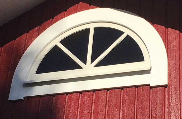Halvrunt fönster monterat på en gavelspets i dekorutförande med svart glas för att inte se in på vinden. Utvändig aluminiumbeklädnad med spröjs.