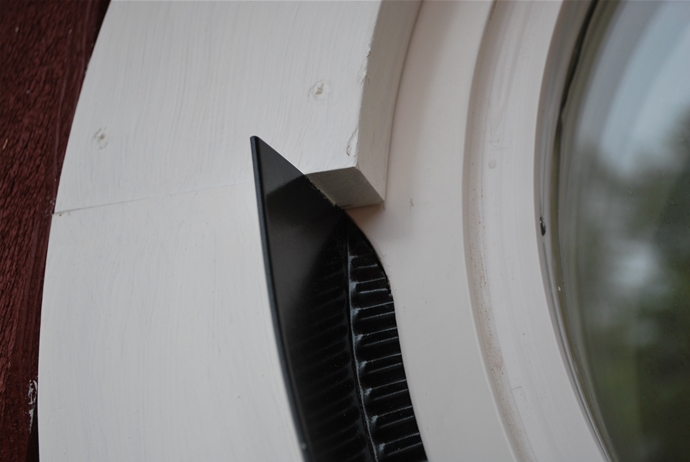 En detalj på hur det blir om du beställer foder och fönsterbleck från oss på ett runt fönster. Vi fräser en fals i karmen där fönsterblecket skruvas, fodret undertill är då lite smalare för att få plats med fönsterblecket.