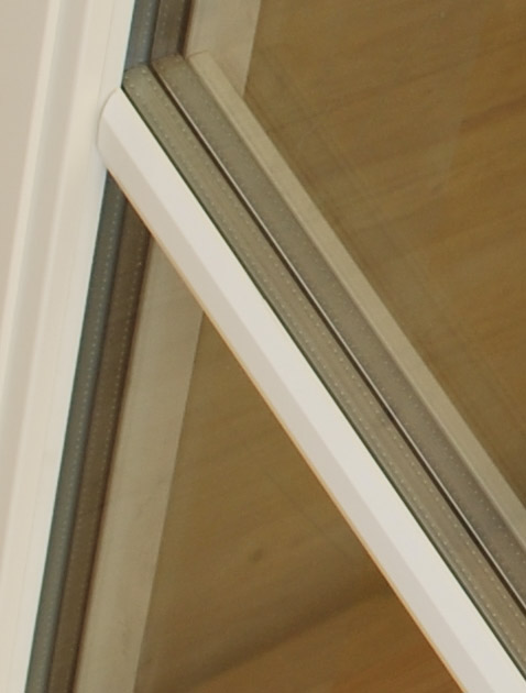 Här ser ni vår Winerspröjs" från insidan på ett fast halvrunt fönster. Normalt är det lös utanpåliggande spröjs på fasta fönster men till våra specialfönster kan vi montera spröjs på båda in & utsidan av glasen. Har du alla fönster med äkta kittad spröjs rekomenderar vi vår winerspröjs för att få den gamla känslan även på fasta specialfönster.