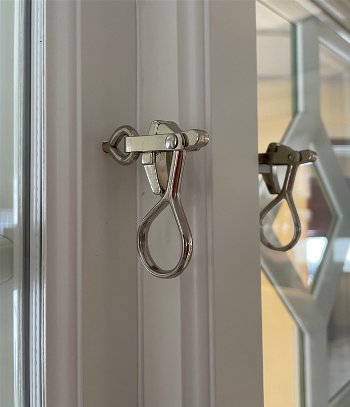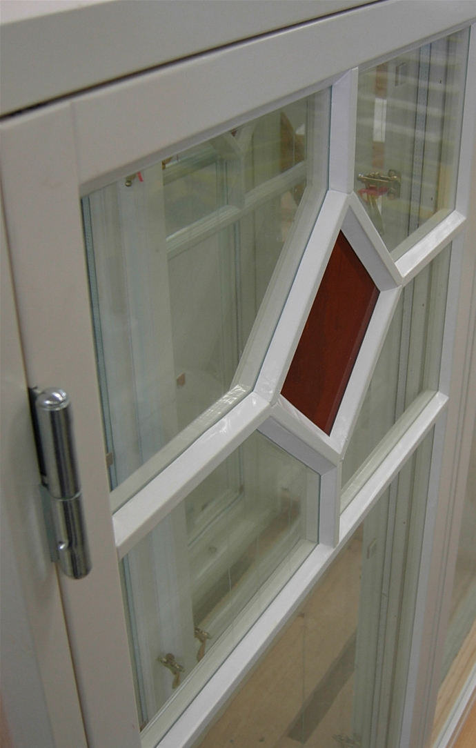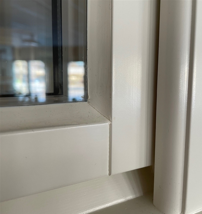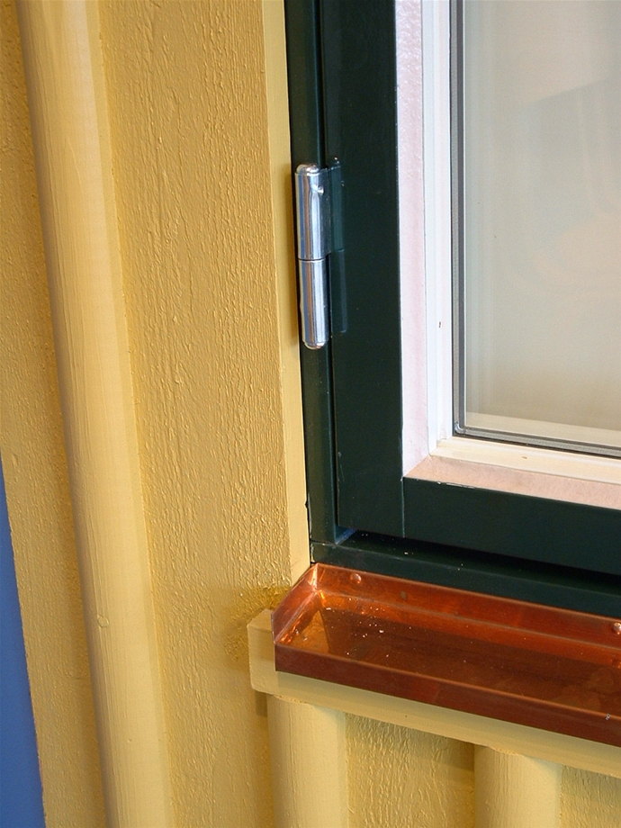 Här visar vi ett kopplat utåtgående fönster från utsidan där den utvändiga sidan är målad grön och kunden valt beige kitt, gångjärnen är standard 1228-85Z. Fönsterblecket är i koppar (ingår inte i fönsterleveransen) som är monterat i det utvändiga spåret i karmbotten.