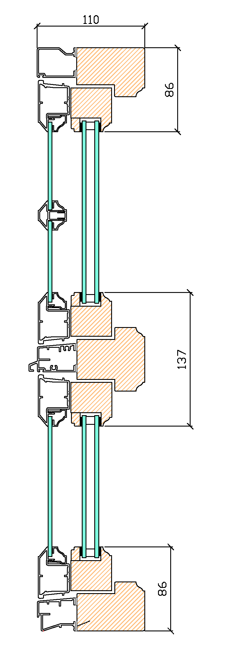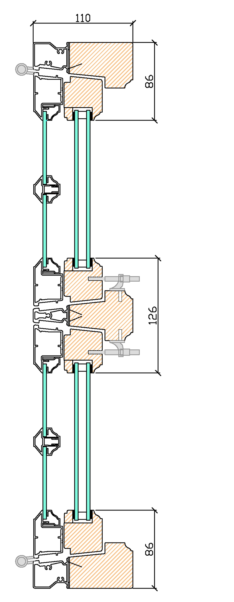 Utåtgående fönster 2+1, Trä/alu – Profilsnitt