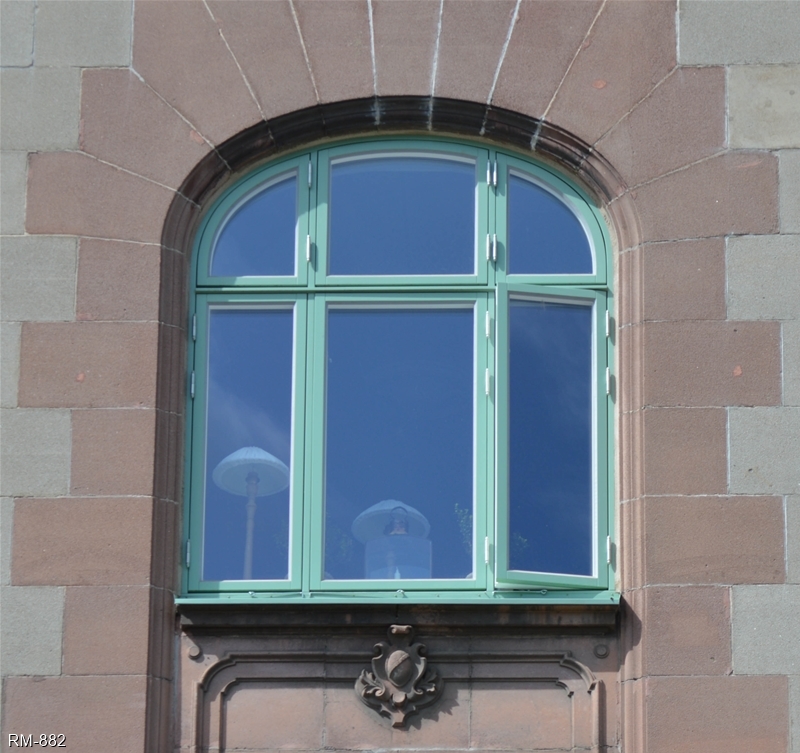 Specialfönster som mallats på plats, sexlufts elipsformat med förskjutna poster lika orginalfönstret.