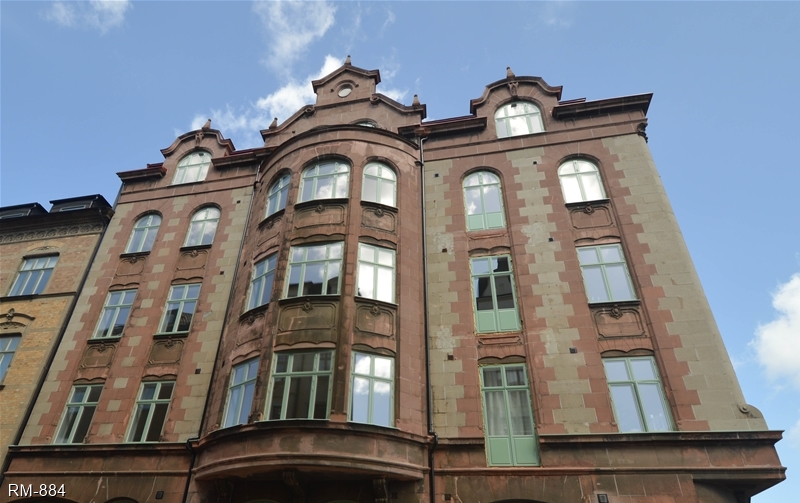 Gavelfasaden med vackert burspråk, nya pardörrar som ska förses med nya balkonger.
