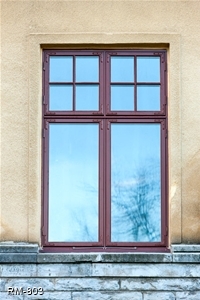 Här ses husets fasad från 2 sidor, alla fönster är tillverkade efter dom gamla fönstren i form och indelning, fönstren är målade i röd kulör på utsidan.