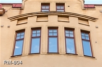 Fönster i ett svängt burspråk med separat överfönster med krysspröjs.