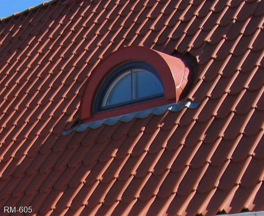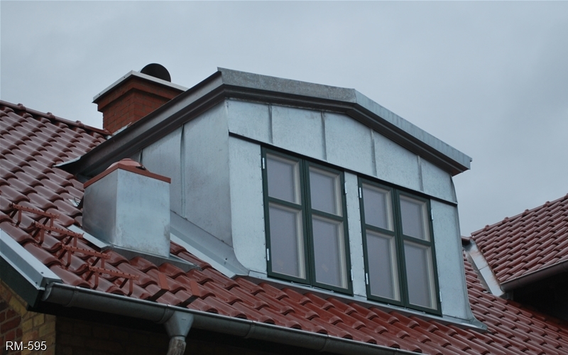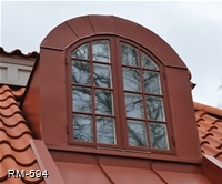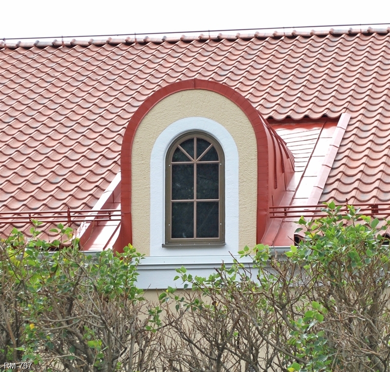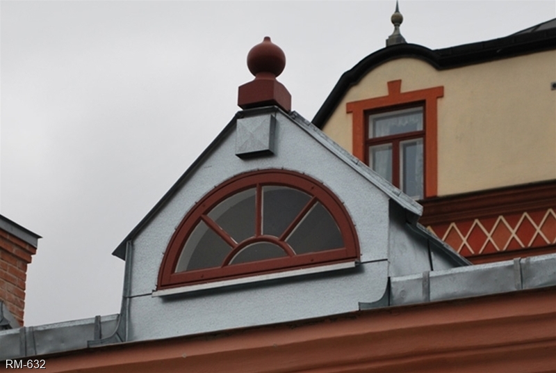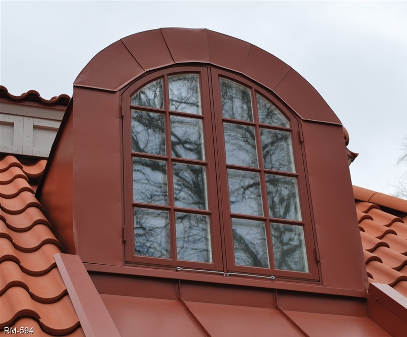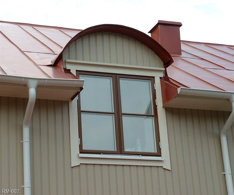 Bågformad plåtklädd takkupa med utåtgående kopplat fönster och kittad spröjs (SP3:1).