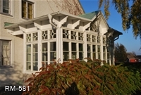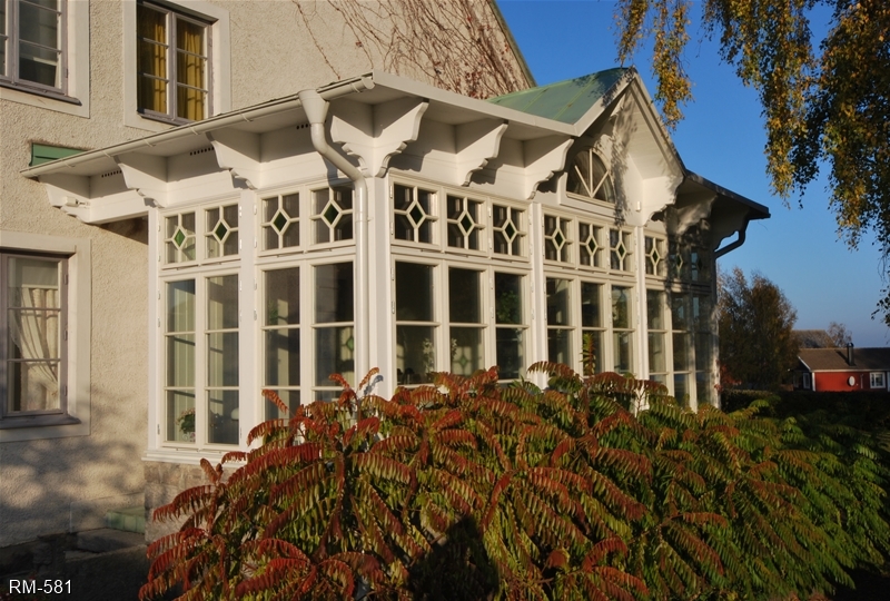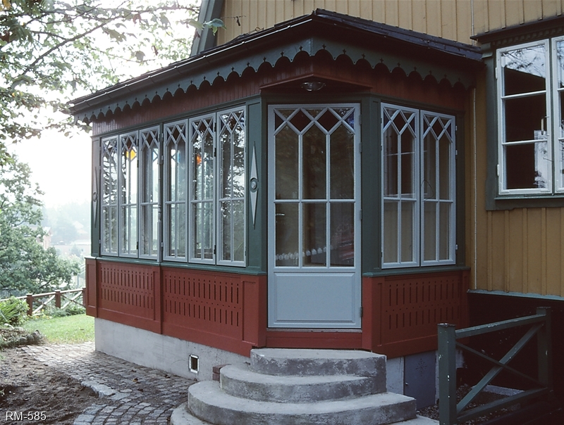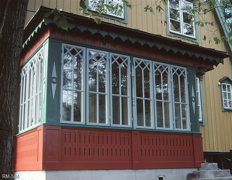 Här ses en veranda med rombspröjs med färgade glas, specialfönster på veranda med kryss och sneda spröjsad fönster upp i gavelspets.