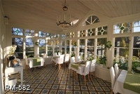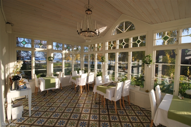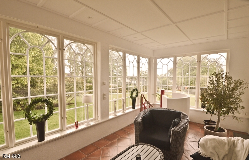 Veranda med höga spröjsade fönster för mycket ljusinsläpp i rummet, pardörren i mitten har ytterligare mer glas vilket gör att ljuset där kommer ända ner på golvet i rummet.