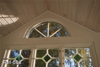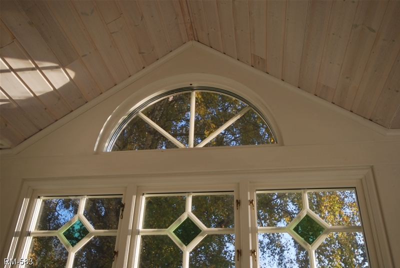 Här ser man hur dörren har ytterligare en spröjs och mer glas. Det halvrunda fönstret i nocken gör att det även taket invändigt blir ljust. Spröjsen på det halvrunda fönstret har förutom en solfjäderspröjs en delning av en svängd spröjs.