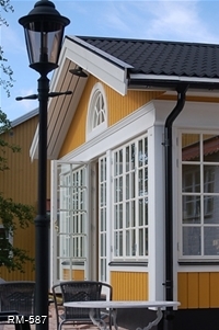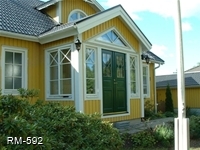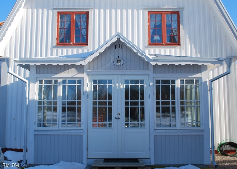 Här är en förstekvist som man valt spröjsade fönster för att få en verandakänsla, även ett ljusinsläpp i gavelspetsen med ett vinkelfönster.