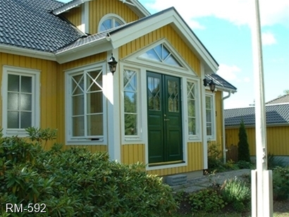 Dörren är här en riktig ytterdörr som man har glasat i samma stil men inte låtit den linjera med fönstren, även färgade glas sitter i ytterdörrens krysspröjs.