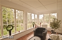 Ett tillbyggt orangeri på ett gammalt hus där man eftersträvat att få det nya orangeriet att smälta in i husets karaktär. stora specialfönster med vacker kittad spörjs.