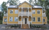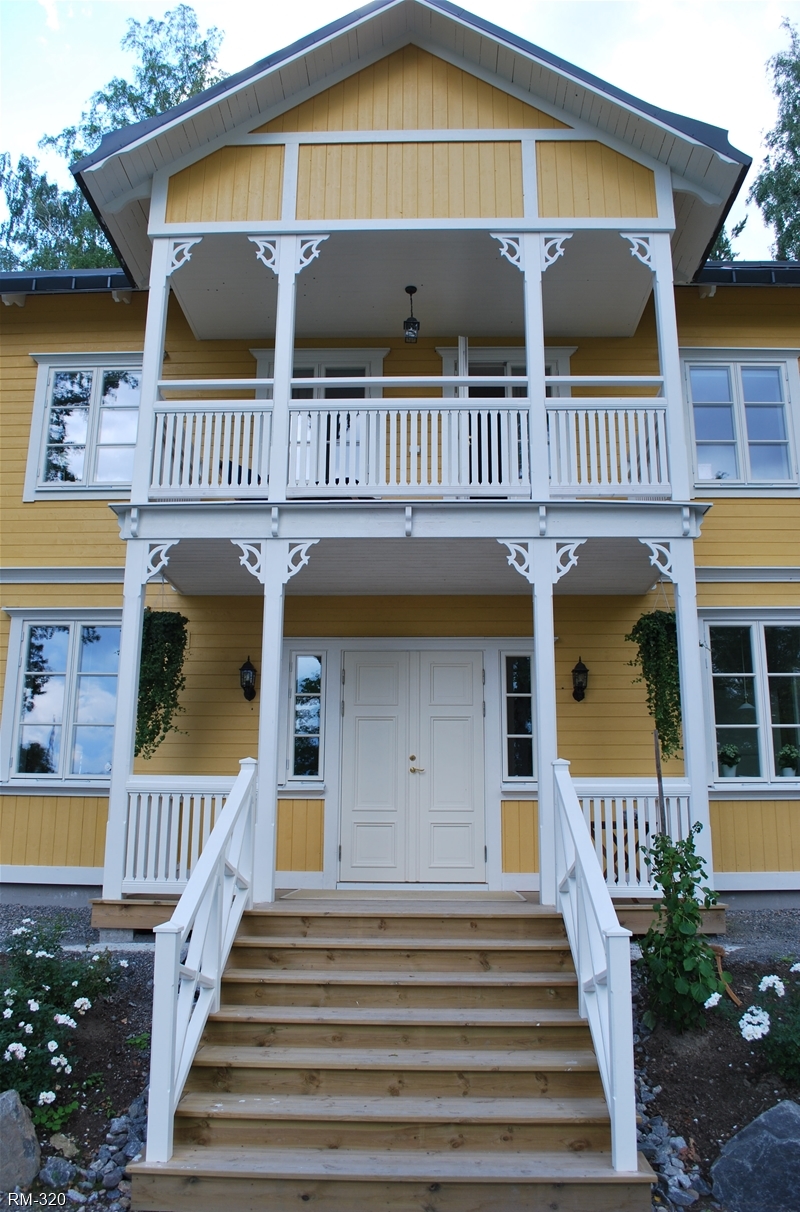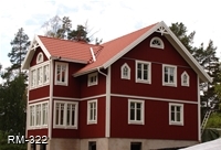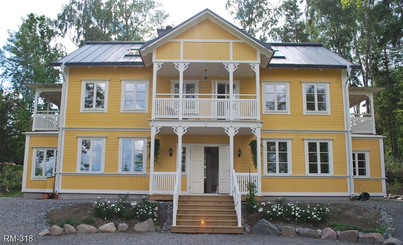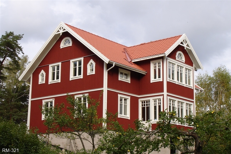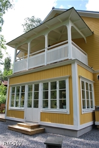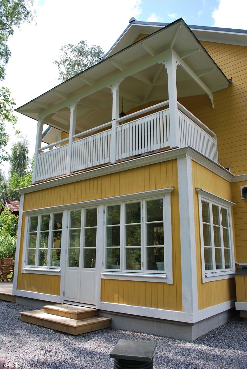 Rött hus med vita knutar och glasveranda i 2-plan , fina gavelfönster i spetsigt utförande samt halvrunda fönster i nock.