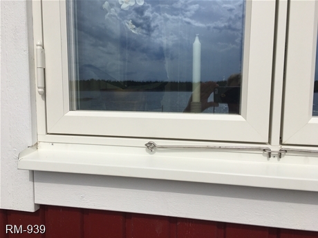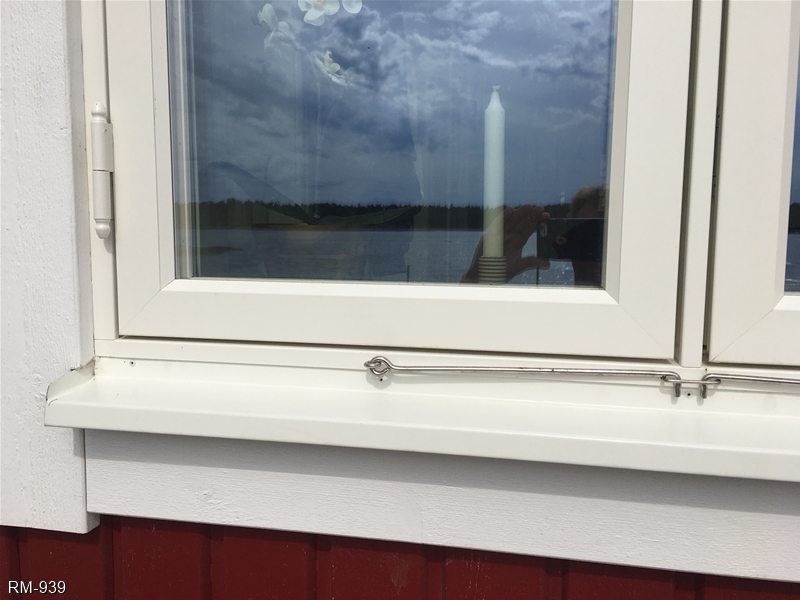 Här har vi levererat målade allmogegångjärn som kunden beställt, stormhasparna i rostfritt material som standard. På plats är det sedan monterat ett fönsterbleck.
