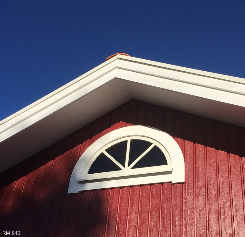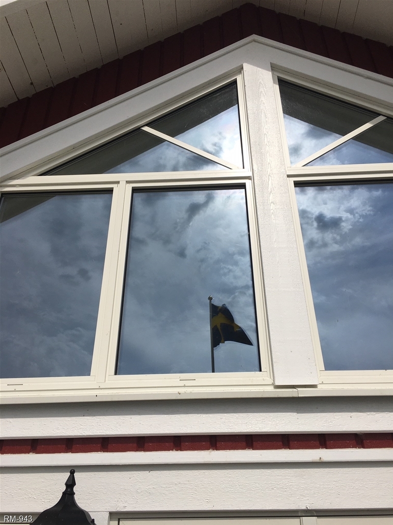 På ena gaveln sitter ett halvrunt dekorfönster med svart glas för att inte man ska se in på vinden. Detta fönster är med enkelglas med utvändig aluminium.