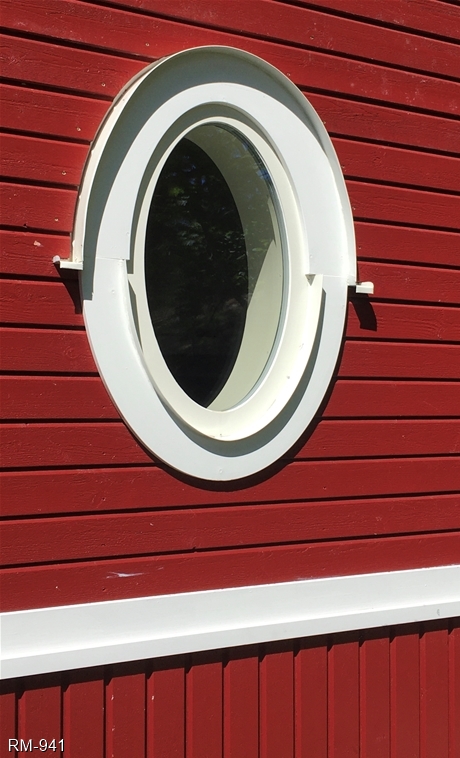 Ovalt fast fönster med utvändig aluminium. Över/underbleck som ser till att vattnet inte kommer in mellan fönster & fasaden.