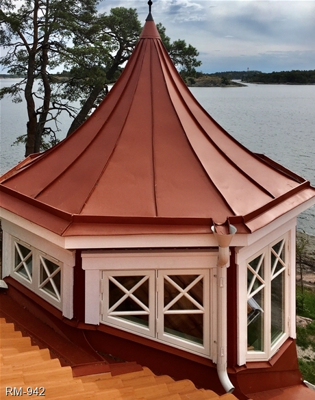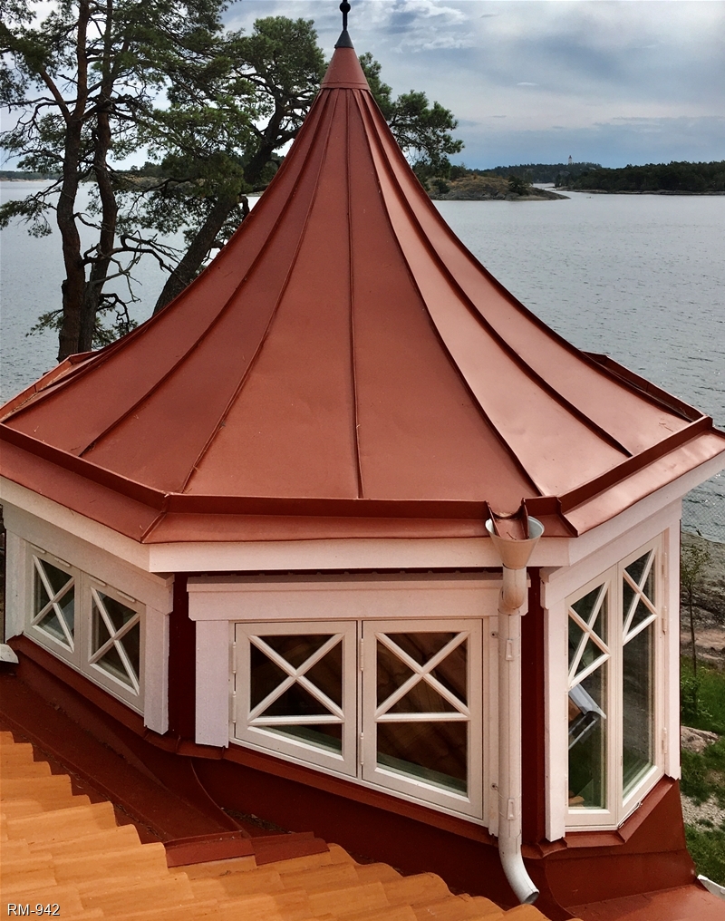 Specialtillverkade fönster för tornets sida mot huset. Fönstren som linjerar med takvinkeln för att få maximalt ljusinsläpp i tornrummet samt ett vackert utseende. Även spröjsen linjerar exakt runt hela tornet. Vackert torn med fina fönster och ett utmärkt jobb med den falsade takplåten.