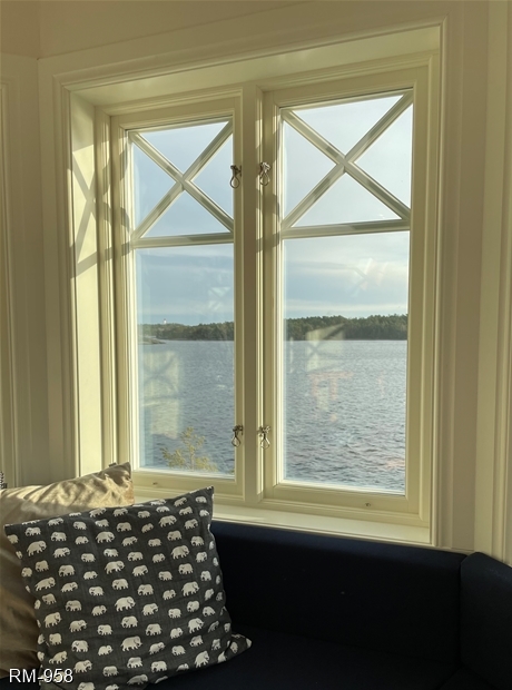 Vacker bild inifrån tornet där solen strålar in genom fönstret som ger vackra skuggor på profilerna och spröjsen, ett optimalt allmogefönster, vitmålat trä invändigt och med utvändig aluminium.